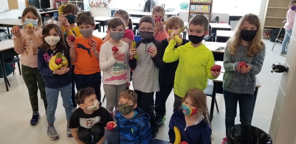 Le 23 février dernier, tous les élèves de l'école Arc-en-ciel ont eu la chance de recevoir une pomme et une banane dans le cadre du défi 5-2-1-0 de la Fondation des maladies du coeur et de l'AVC du Nouveau-Brunswick. 5 portions de fruits et légumes, moins de 2 heures d'écran par jour, 1 heure ou plus d'activité physique par jour et finalement 0 boisson sucrée par jour.